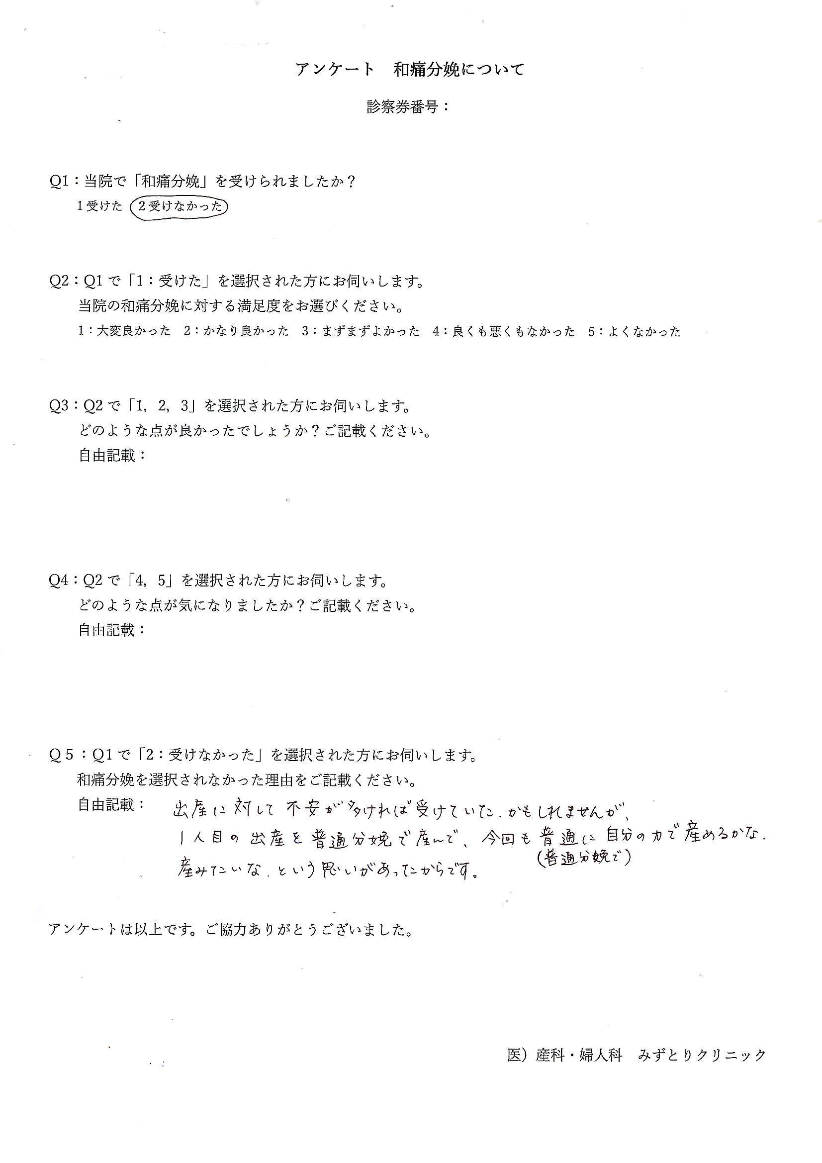 和痛分娩アンケートS.S様 [2025.10.27] Q1:当院で「和痛分娩」を受けられましたか? 2: 受けなかった Q5:Q1で「2:受けなかった」を選択された方にお伺いします。 和痛分娩を選択されなかった理由をご記載ください。 自由記載:出産に対して不安が多ければ受けていたかもしれませんが、 1人目の出産を普通分娩で産んで、今回も普通に(普通分娩で)自分の力で産めるかな、産みたいな、という思いがあったからです。 前の記事へ次の記事へ